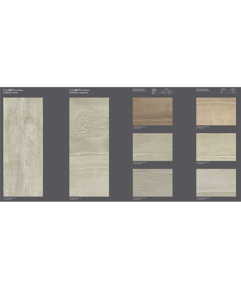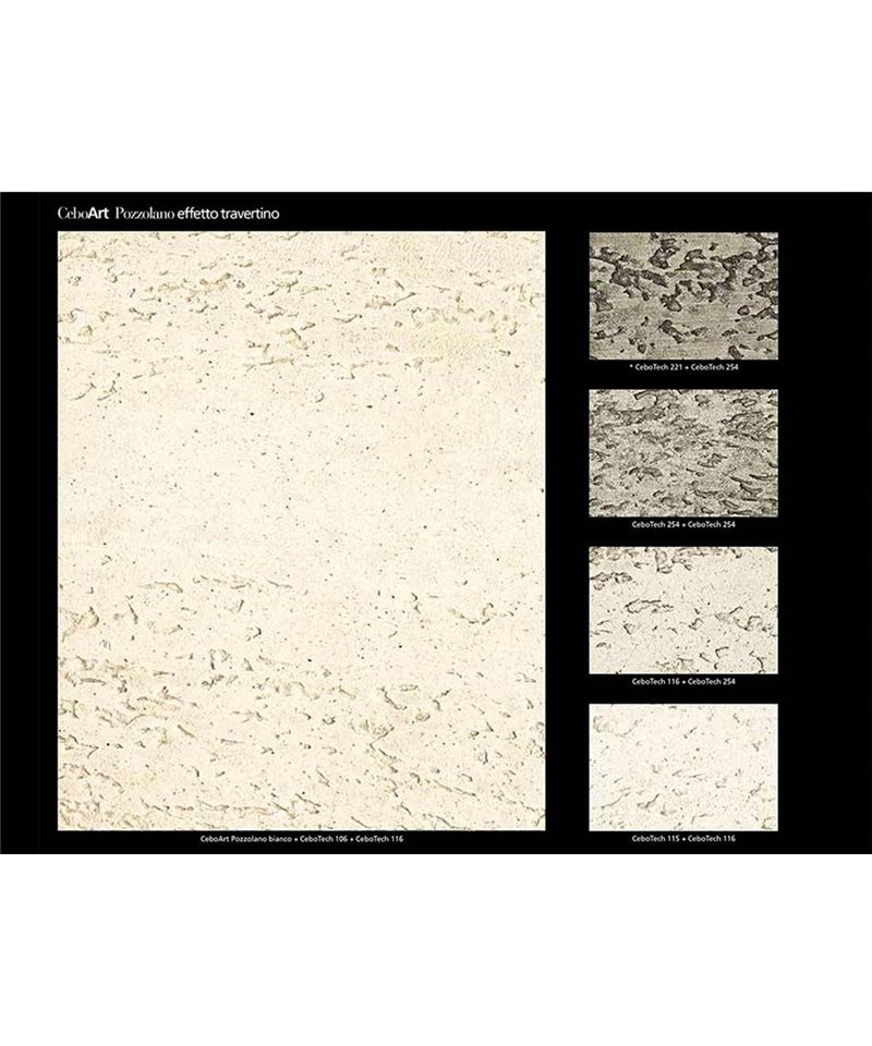 Coating mineral for internal and external, based on slaked lime and powder of marble selected, with qualities of high breathability and resistance to mold and bacteria. CeboArt Pozzolano can be used on all types of fund, properly prepared, and allows you to create fine surfaces with a characteristic effect frame that is reminiscent of the ancient decorations and marbled. Lends itself in particular to achieve finishes decorative that reproduce the veining and the effect of the famous stone roman.