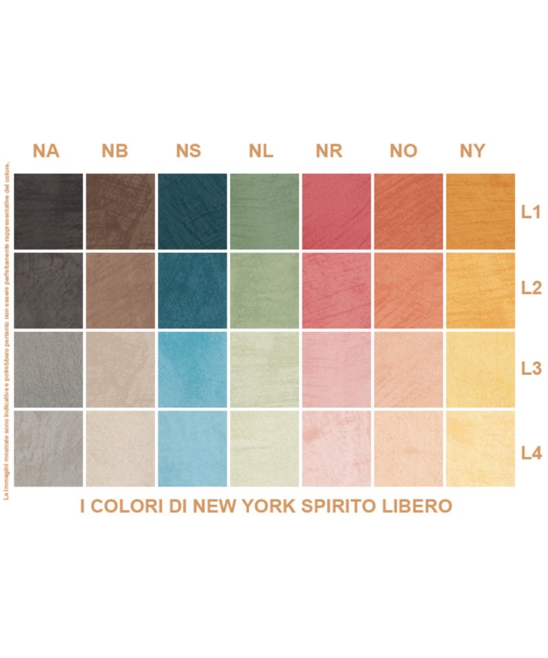 SPIRITO LIBERO, stucco di design che crea una parete semplice e pulita ma ricca di estetica e raffinatezza dalla linea " I COLORI DI NEW YORK". Colorato e miscelato in sede con macchinari professionali, é sufficiente scegliere il colore e la tonalità da cartella per avere il prodotto pronto ad essere applicato.